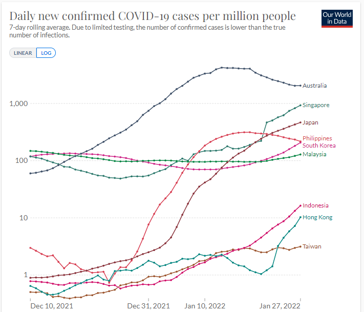 오미크론이 아프리카, 유럽, 남북미, 호주에 급속 확산하던 시기에 동아시아에서 상대적으로 느린 확산속도를 보였다. 그러나 오미크론 변이 비율이 90% 이상에 도달하면서 확진자가 재차 급증하고 파동이 연장되는 양상이다.